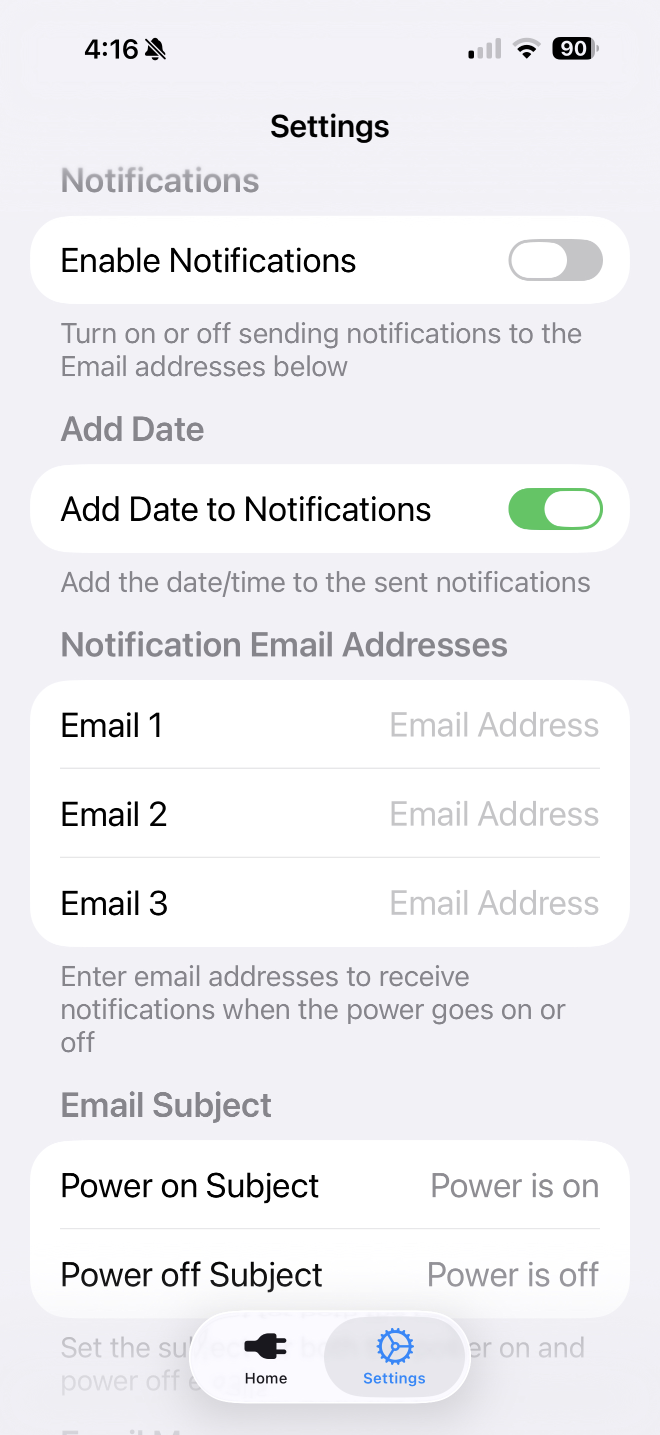 - Enable Notifications: this toggle turns on or off the notifications from the app. With this off, the app will not send any notifications to the email addresses when the power state changes. Keep Alives will not be sent either.