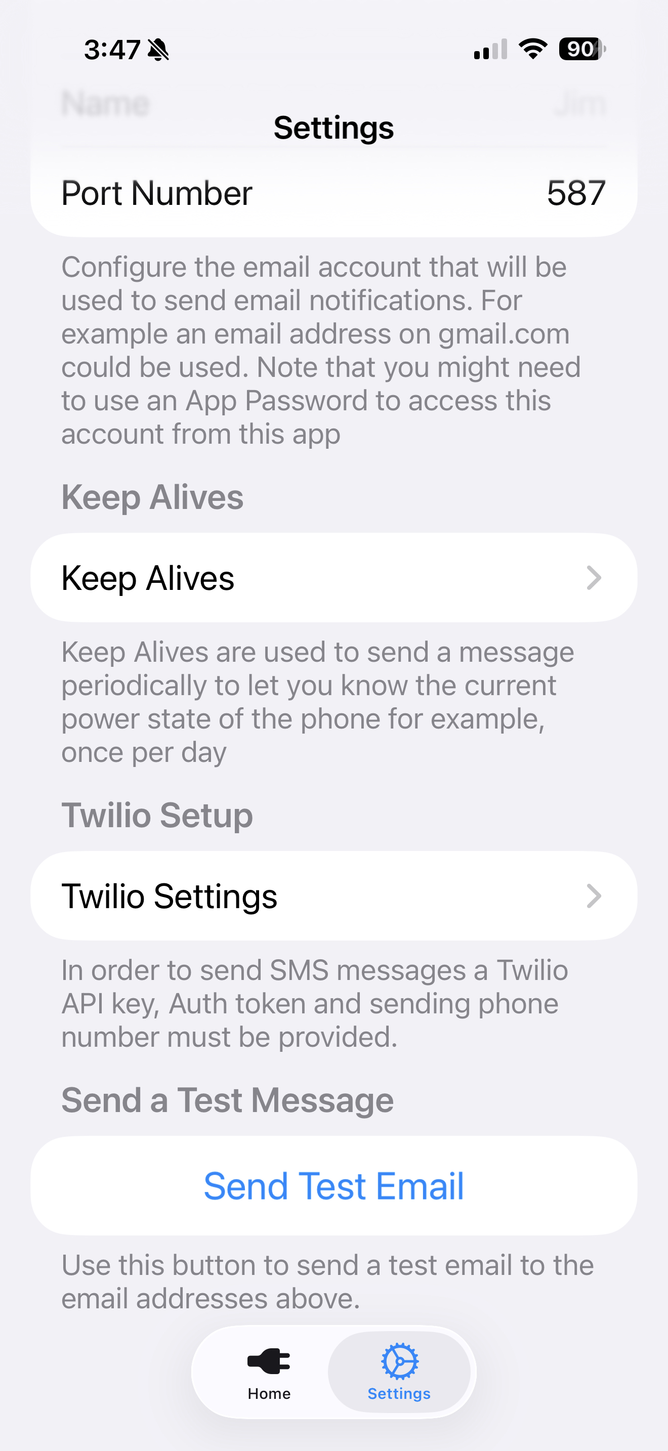 In order for the app to work correctly Siri Automations must be configured to connect power events to the application. Basically the Siri Automation calls into the app each time the power goes on or off. Additionally Siri Automations can be used to run a recurring notification (keep alive) so that the app sends a message once a day with the current power state. The app does not need to be currently running on the device for it to work because Siri will automatically start the app when the power state changes and the emails will be sent.