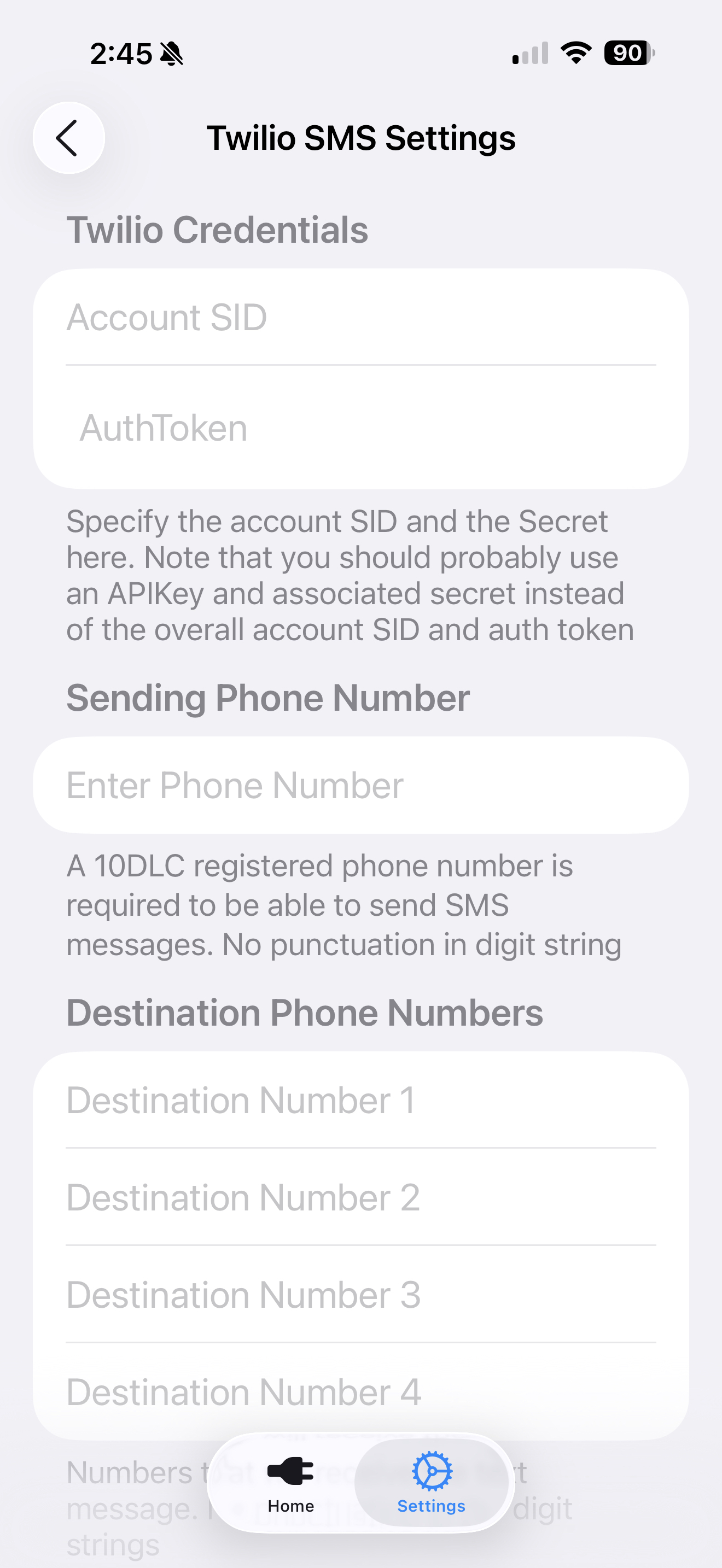 - Destination Phone Numbers: These are the number or numbers to receive SMS text messages from the PowerDetector App