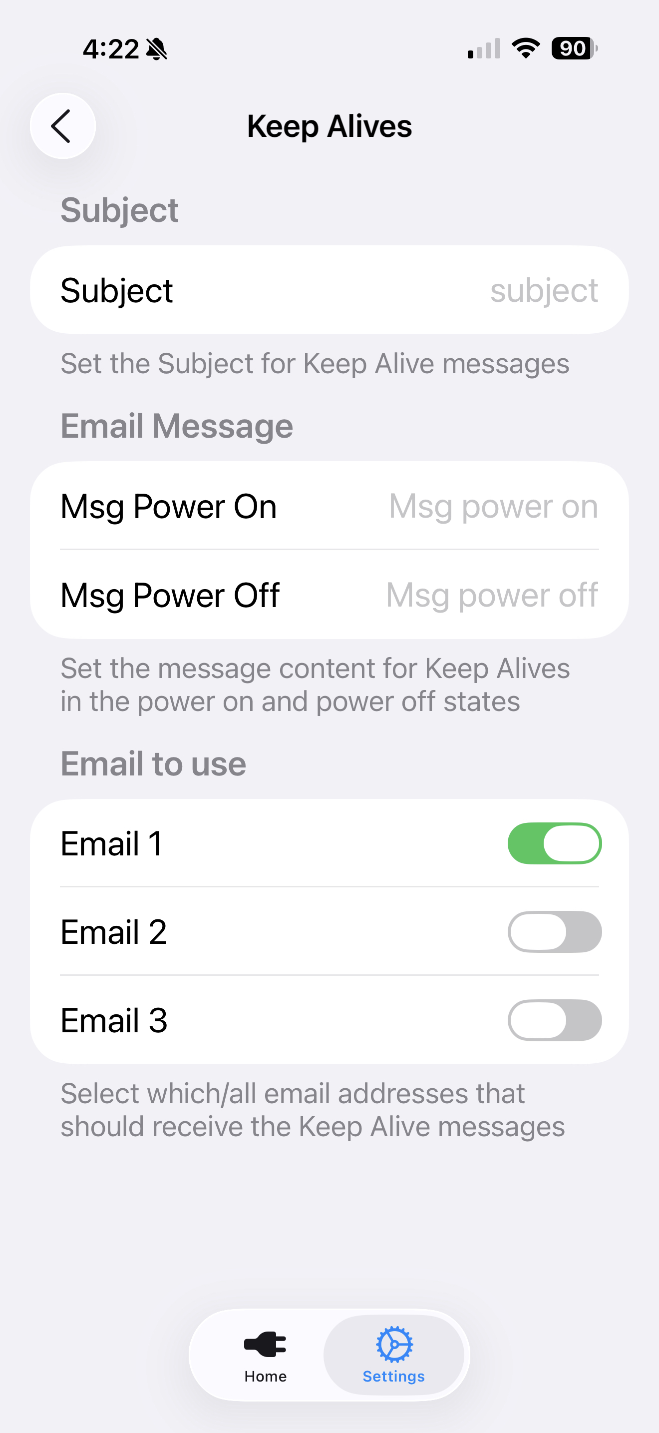 Keep Alives: This app has the option to send a periodic message to the email destinations, reporting the current power state. Typically you might configure this to send once a day or once a week.