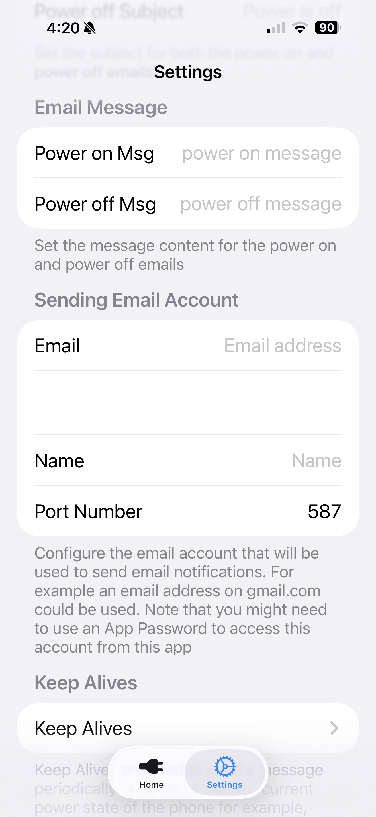In order for the app to work correctly Siri Automations must be configured to connect power events to the application. Basically the Siri Automation calls into the app each time the power goes on or off. Additionally Siri Automations can be used to run a recurring notification (keep alive) so that the app sends a message once a day with the current power state. The app does not need to be currently running on the device for it to work because Siri will automatically start the app when the power state changes and the emails will be sent.