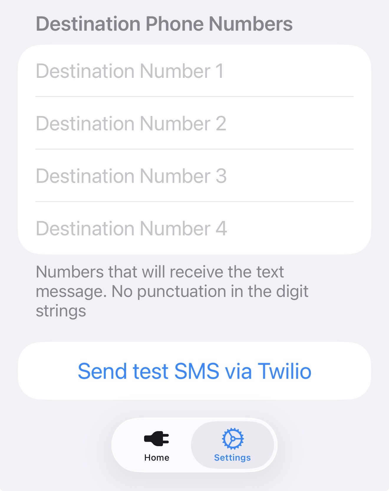 - Destination Phone Numbers: These are the number or numbers to receive SMS text messages from the PowerDetector App